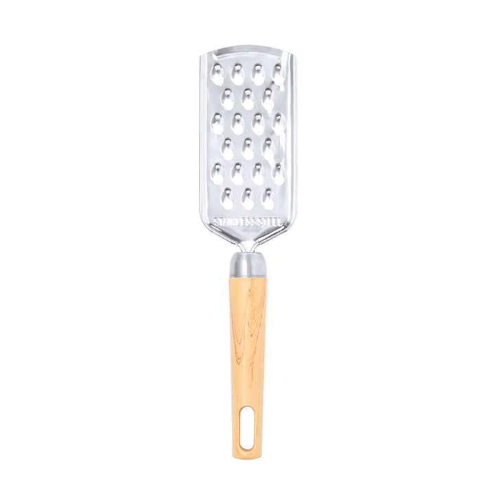 Handreibe aus Edelstahl. Es verfügt über einen ergonomischen Griff aus PP mit einer Öffnung zum einfachen Aufhängen. Präsentiert in einer recycelten Papiertüte.