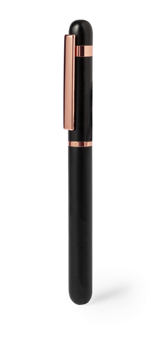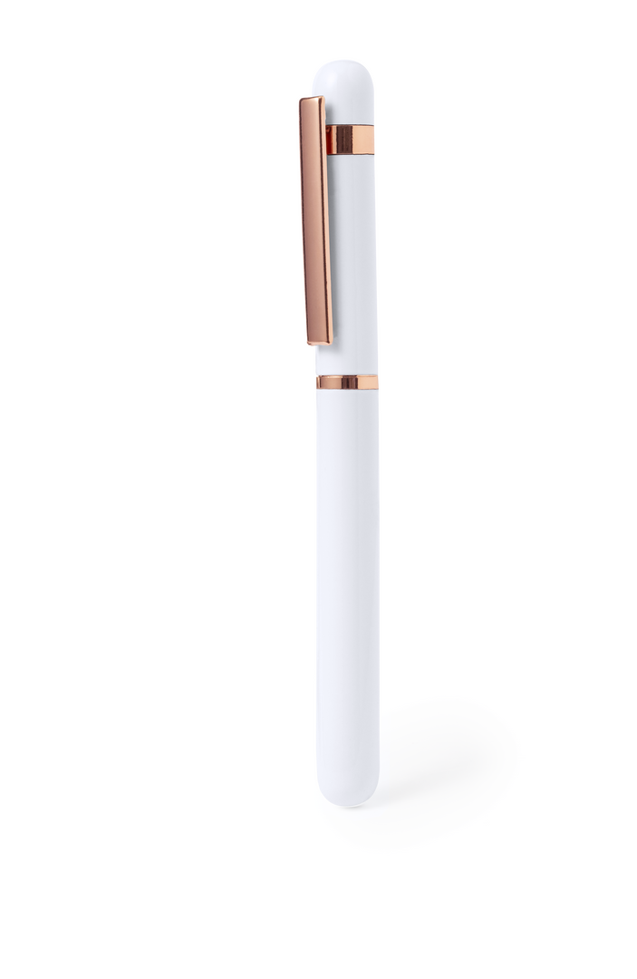 Eleganter Rollerball speziell für die Laserbeschriftung mit rosa Logo. Mit Metallclip und Kunststoffdetails in rosa Ausführung. Mit Jumbo-Patrone, blauer Tinte und Kapuzenverschluss. Erhältlich in zwei auffälligen Farben.Präsentiert in eleganter schwarzer Designerbox.