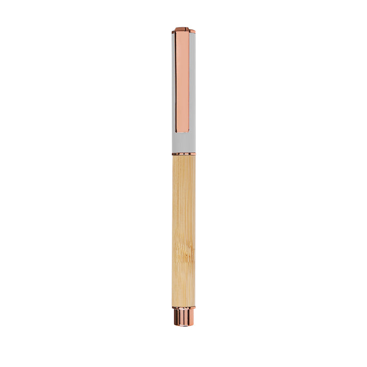 Eleganter Rollerball-Stift aus Bambus und Aluminium. Mit Metallclip, Griff und Details in Chrom und Roségold, Bambuskorpus und farbigem Aluminiumkappe. Mit Jumbo-Patrone, blauer Tinte und Kappe.