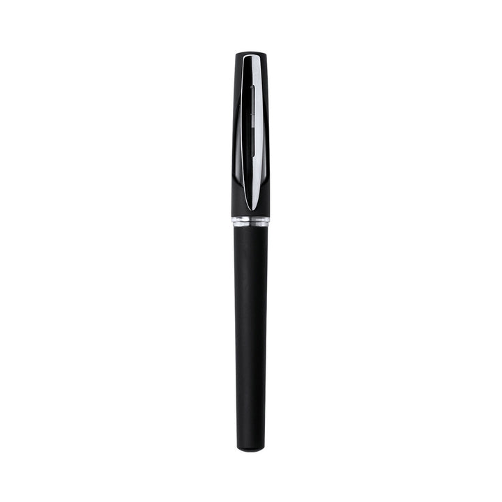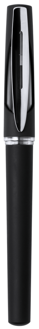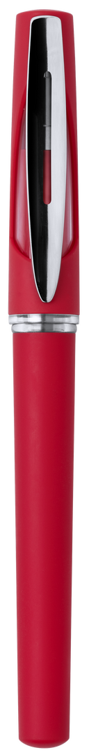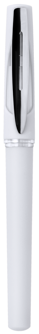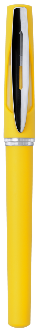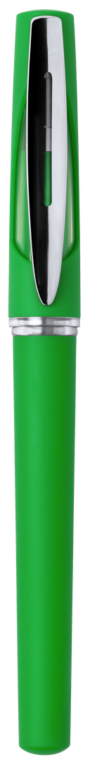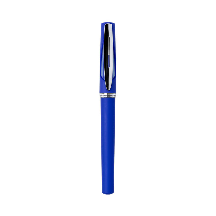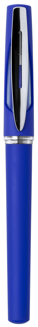 Zweifarbiger Tintenroller mit Kappe im bunten Design mit glattem, farbenfrohem Schaft und silberglänzenden und transparenten Details. Blaue Geltinte.