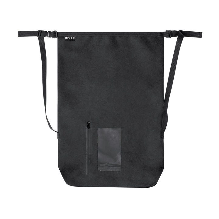 Wasserdichter Rucksack mit großem Fassungsvermögen (25 l), hergestellt aus strapazierfähigem 300D RPET. Mit Sicherheitsschloss, Griff mit Schnallenverstellung, Karabiner und verstellbaren Riemen. Darüber hinaus verfügt es über ein Front-Touch-Fenster aus transparentem PVC. Mit markantem RPET-Label, in vielen Farben erhältlich und in einer individuellen Recycling-Tasche präsentiert. RPET-Material wird aus recyceltem Kunststoff hergestellt und fördert so die Wiederverwendung von Kunststoffabfällen und trägt zur Nachhaltigkeit des Planeten bei.