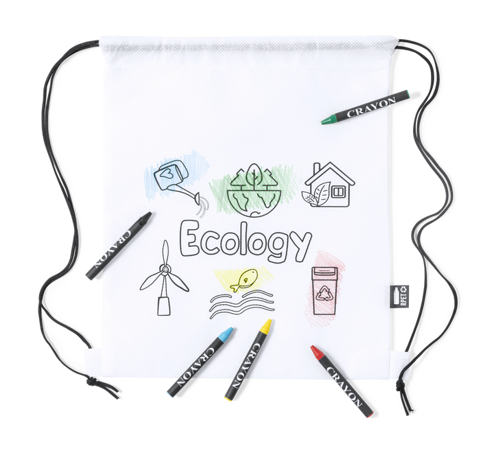 Mochila de cuerdas fabricada en non-woven RPET de color blanco, especialmente diseñada para colorear con ceras. Incluye 5 ceras en variados colores. Con cuerdas de cierre en color negro y refuerzo en las esquinas. Distintivo RPET en etiqueta exterior.El material RPET se elabora a partir de plástico reciclado, para así fomentar la reutilización de residuos plásticos y ayudar a la sostenibilidad del planeta.