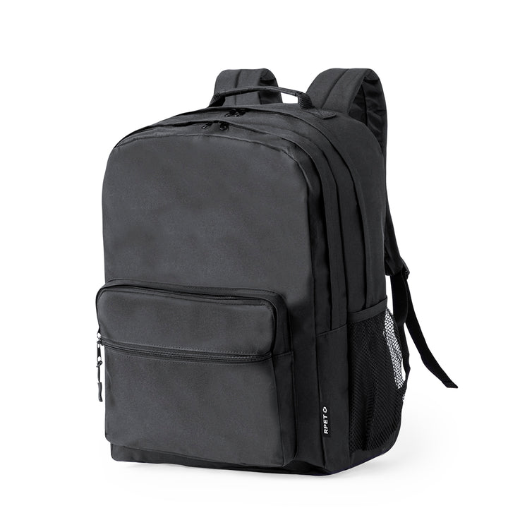 Rucksack aus strapazierfähigem 600D RPET. Er verfügt über zwei zentrale Taschen mit Doppelreißverschluss und zwei Fronttaschen für bequemen Zugang. Im Inneren hat es eine gepolsterte Tasche für einen Laptop bis zu 15 Zoll. Die Rücken- und Schultergurte sind gepolstert und verstellbar, mit atmungsaktivem Stoff. Er verfügt auch über einen oberen Riemen und eine seitliche Netztasche. RPET-Logo auf dem Etikett. Präsentiert in einer individuellen Recycling-Tasche.RPET-Material wird aus recyceltem Kunststoff hergestellt, um die Wiederverwendung von Kunststoffabfällen zu fördern und die Nachhaltigkeit des Planeten zu unterstützen.