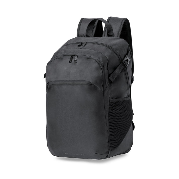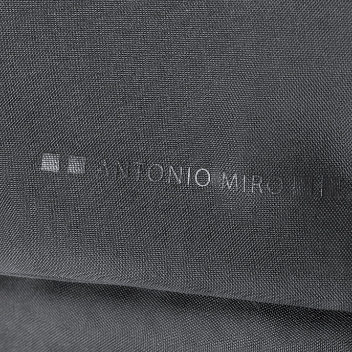 Antonio Miro Rucksack aus strapazierfähigem 300D Polyester mit schwarzer Oberfläche. Hauptfach und Außentaschen mit passendem Reißverschluss Tragegriff und Seitentaschen. Seitlich verstellbare Riemen mit Schnallenverschluss und Markenlogo am Boden. Gepolsterte Innenfächer für Laptops bis zu 17" und Tablets bis zu 10". Gepolsterter Rücken und verstellbare, gepolsterte Schultergurte mit hinterer Verstellmöglichkeit für Trolley-Stange.