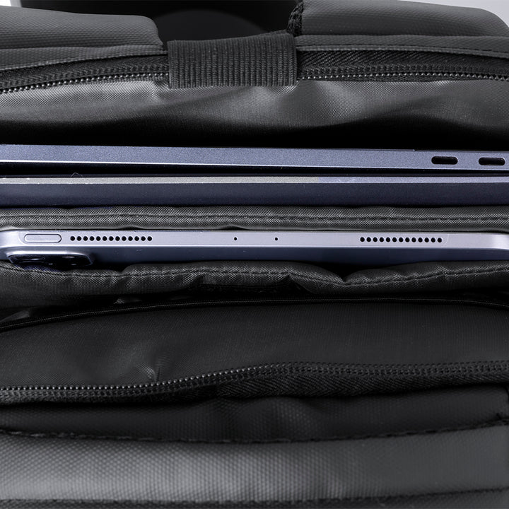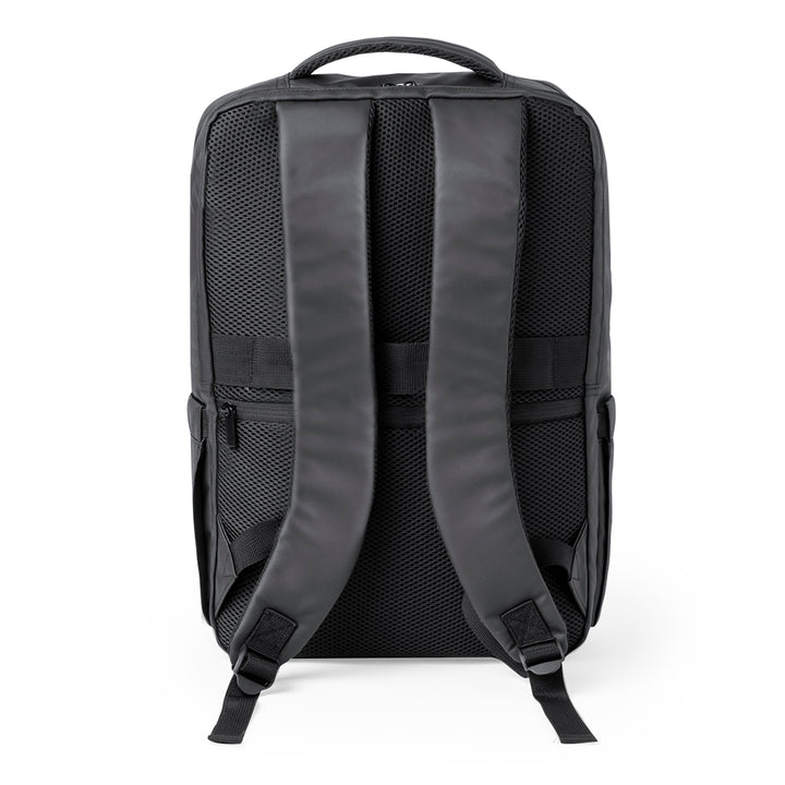 Hochwertiger Rucksack von Antonio Miró aus widerstandsfähigem Kunstleder mit schlichtem Design in Schwarz. Mit doppeltem Reißverschluss, Vordertasche und verstärktem, gepolstertem Griff. Mit ergonomischer Polsterung an Rücken und Schultergurten verfügt es über ein gepolstertes Innenfach für einen Laptop bis 15 Zoll und für Tablets bis 10 Zoll. Zusätzlich mit einer diebstahlsicheren Tasche mit Reißverschluss auf der Rückseite. Innenhüllen für Stifte und Smartphone. Mit Markenlogo auf der Vorderseite.Gepolstert.