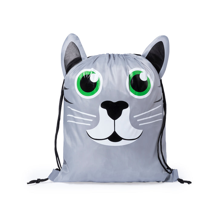 Faltbarer Rucksack mit Kordelzug für Kinder. Hergestellt aus weichem 210T Polyester mit originellen Tier-Designs. Mit Zugbändern in Schwarz und verstärkten Ecken. Faltbar auf kleine Größe.