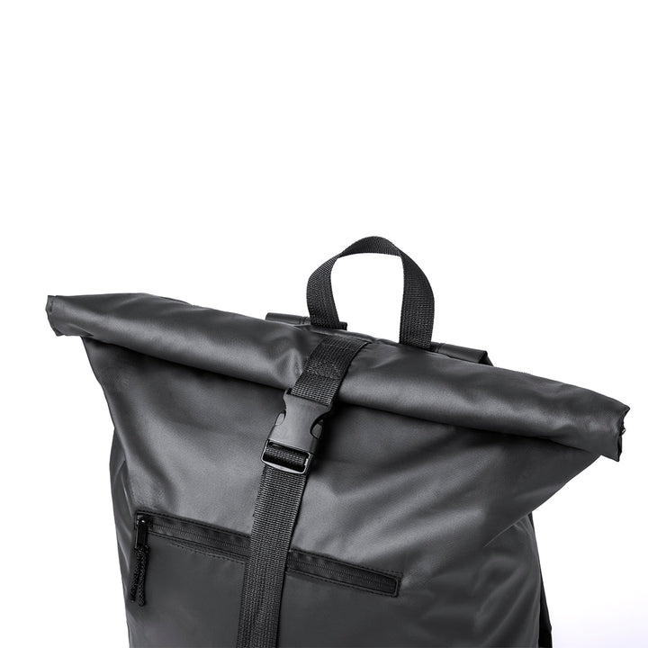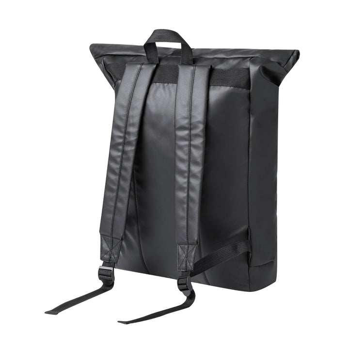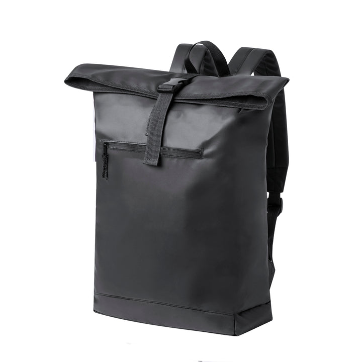 Rucksack aus weichem PU-Leder. Mit einer Haupttasche, die mit einer Schnalle verschlossen wird, und einer zusätzlichen Fronttasche mit Reißverschluss. Im Inneren befindet sich ein gepolstertes Fach für Laptops bis 15 Zoll, sowie ein kleines Reißverschlussfach. Die Schultergurte sind gepolstert und verstellbar, oben befindet sich ein praktischer Tragegriff. Präsentiert in einer einzelnen recycelten Tasche.