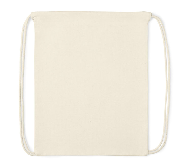 Linie Natur Rucksack mit Kordelzug aus 100% Baumwolle 180g/m2 in natürlicher Ausführung. Hauptfach mit Kordelzügen aus Baumwolle.