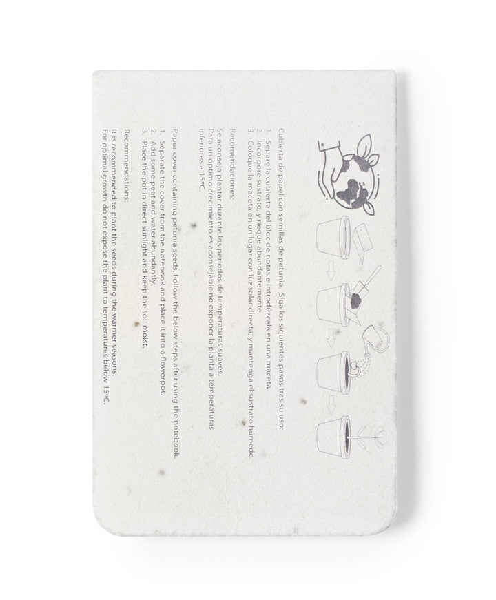 Linie Natur Notizblock, mit Umschlägen aus recyclebarem und abbaubarem Saatgutpapier. Mit Petuniensamen auf beiden Umschlägen, so dass das Papier am Ende seiner Nutzungsdauer eingepflanzt werden kann. Innen mit 10 mittleren Haftnotizen und 30 Mini-Haftnotizen in verschiedenen Farben. Blumen in verschiedenen Farben, mit Pflanzanweisungen auf der Rückseite und in einer individuellen Papiertüte aus recyceltem Papier.