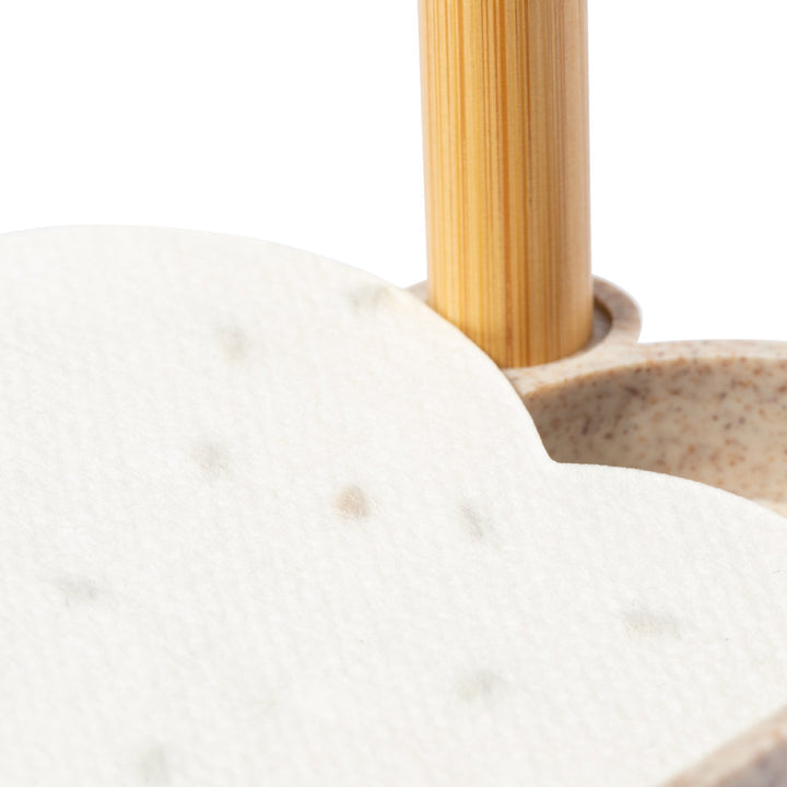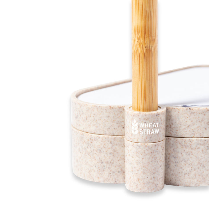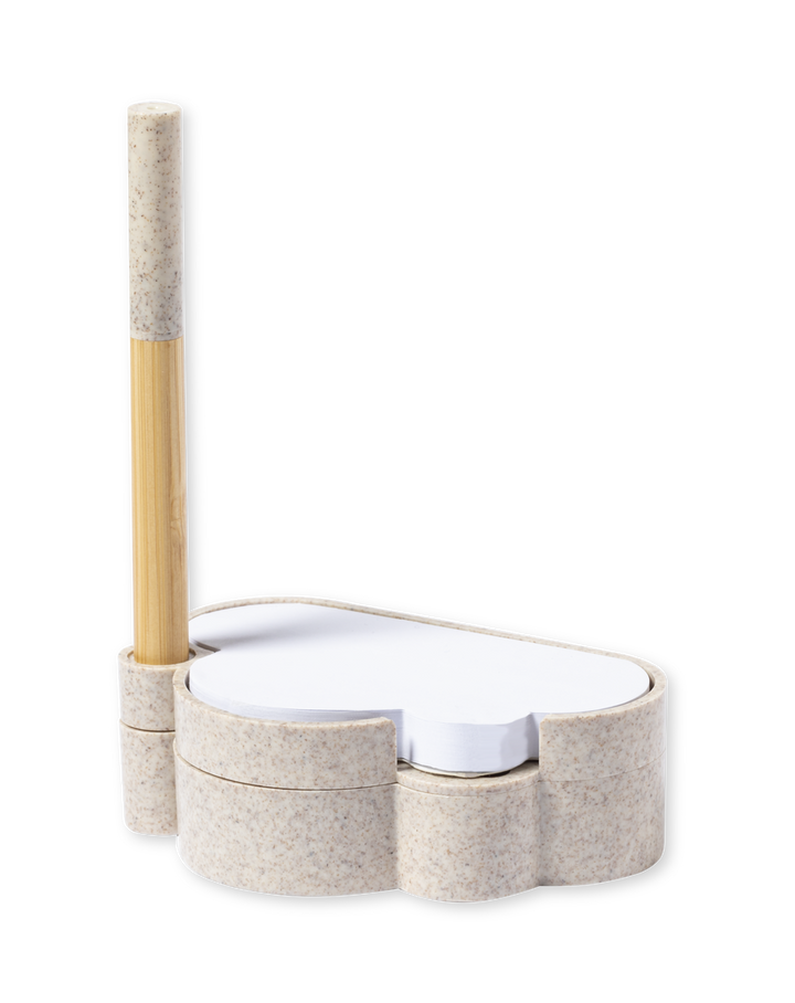 Linie Natur Samen-Notizblockhalter mit originellem Wolkendesign. Enthält:Notizblock mit 80 weißen Zetteln in Form einer Wolke.Sockel mit Stiftehalter und zwei Fächern, inklusive einem Blatt Saatgutpapier.Hergestellt aus Weizenstroh, um die Verwendung natürlicher Rohstoffe zu fördern und Schadstoffemissionen zu reduzieren.Kugelschreiber Pointer mit Bambusgehäuse, Kappe und Details aus Weizenstroh. Mit blauschreibender Tinte.Das Set wird in einer individuellen Design-Kraftbox präsentiert, mit einer Bedienungsanleitung in Englisch und Spanisch.