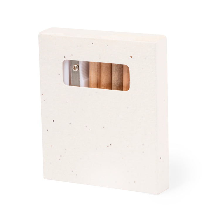 Set aus 6 Stiften mit Malschablonen und Anspitzer, präsentiert in einer natürlichen Kartonschachtel mit Samen. Holzstifte mit rundem Körper mit natürlicher Oberfläche und Minen in einer breiten Palette von Farben. In der Schachtel sind Petuniensamen enthalten, so dass der Karton am Ende seiner Nutzungsdauer bepflanzt werden kann. Blumen in verschiedenen Farben, mit Pflanzanleitung auf der Rückseite.