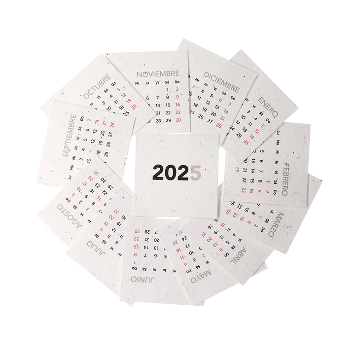 Pflanzbarer Kalender aus Samenpapier. Enthält 13 Blätter mit Petuniensamen in verschiedenen Farben, die nach ihrer Lebensdauer zu pflanzbarem Papier werden. Monatsdesign des aktuellen Jahres, mit nationalen Feiertagen in Rot und regionalen Feiertagen in Grün markiert. Präsentiert in einer Halterbox aus Karton.