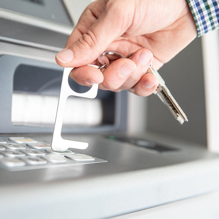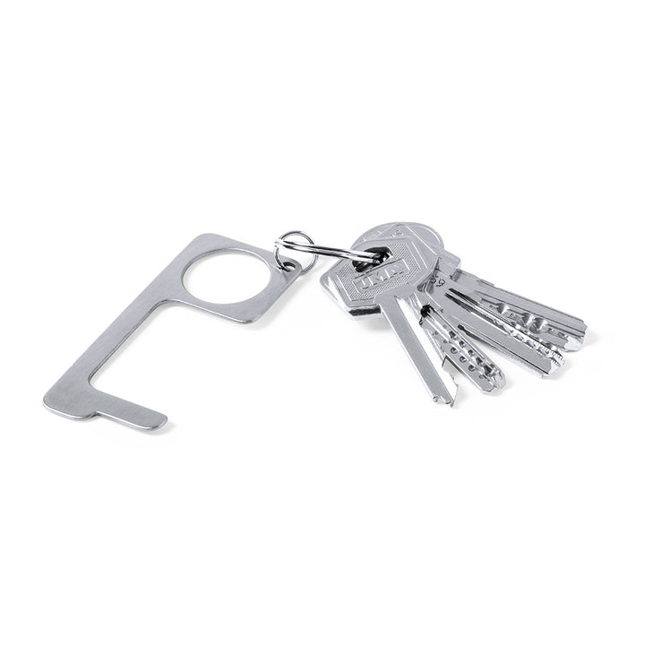 Hygienischer, berührungssicherer Sicherheitsschlüsselanhänger aus widerstandsfähigem Edelstahl. Speziell entwickelt, um das Berühren von Oberflächen im öffentlichen Bereich mit den Händen zu vermeiden (Türgriffe, Schalter, Wasserhähne im öffentlichen Bereich, Geldautomaten...). Mit komfortablem Ausschnitt für den Finger und in einer individuellen Tasche präsentiert. Empfohlen für Laserdruck.