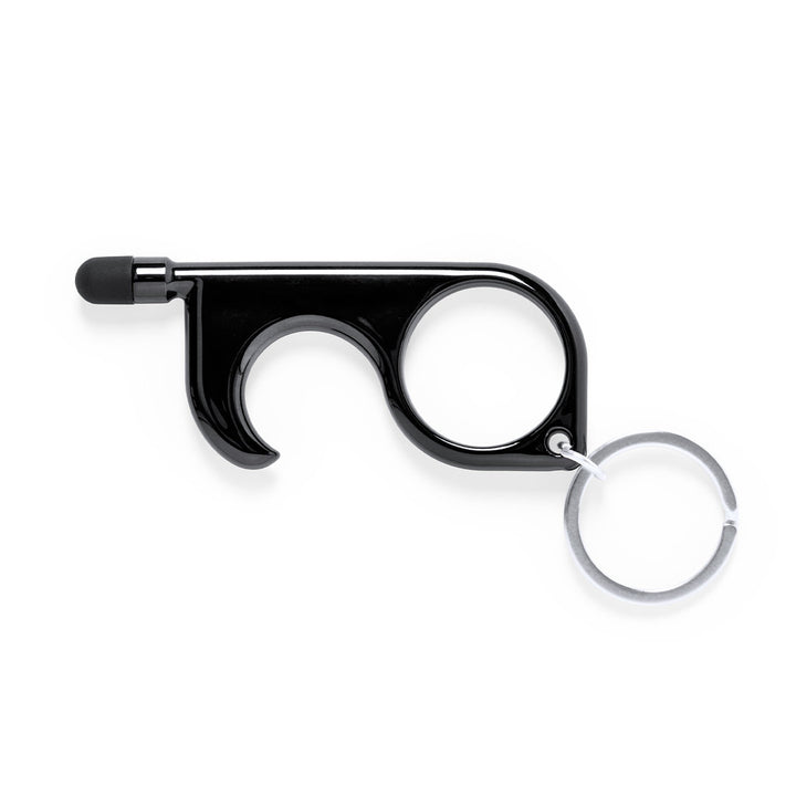 Hygienischer Anti-Kontakt-Schlüsselanhänger mit integriertem Stift und Zeiger. Hergestellt aus langlebigem ABS mit Metallic-Finish und in einer großen Auswahl an Farben erhältlich. Speziell entwickelt, um das Berühren gewöhnlicher Oberflächen mit den Händen zu vermeiden (Türgriffe, Schalter, öffentliche Wasserhähne, Geldautomaten...). Mit einer bequemen Fingerstanzung und in einer individuellen Designtasche präsentiert. Empfohlen für Tampondruck.