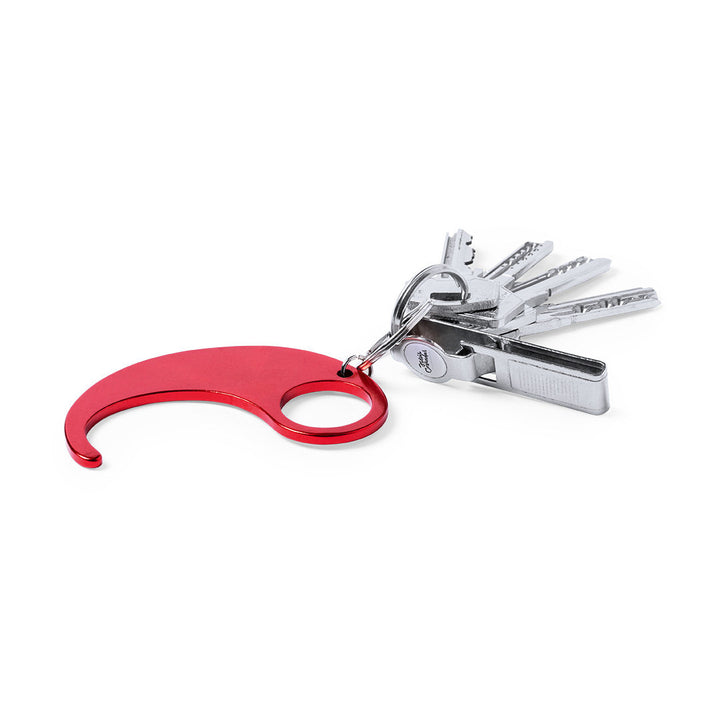 Hygienischer berührungssicherer Schlüsselring aus widerstandsfähigem Aluminium. Der einzige Schlüsselanhänger, der speziell für den Gebrauch in öffentlichen Verkehrsmitteln und zur Vermeidung des Berührens gemeinsamer Oberflächen mit den Händen (Türgriffe, Schalter, öffentliche Wasserhähne, Geldautomaten...) entwickelt wurde. Er verfügt über einen großen Markierungsbereich und bietet einen komfortablen Griff. Aluminiumoberfläche in hellen und vielfältigen Farben. Präsentiert in einer individuell gestalteten Tasche.