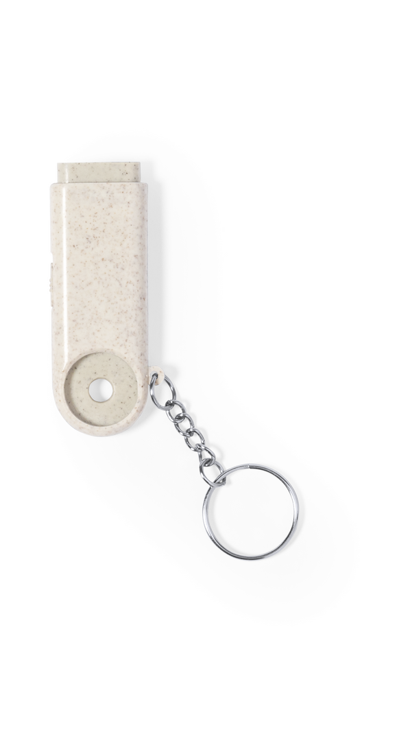 Münz-Schlüsselanhänger mit integrierter Taschenlampe, aus Weizenrohr und ABS. Mit praktischer Münze, 2 LEDs und Batteriebetrieb (Knopfbatterien enthalten). Mit Weizenstroh-Logo und in einer individuellen, recycelten Tasche.Hergestellt aus pflanzlichen Elementen, um die Verwendung natürlicher Rohstoffe zu fördern und die Schadstoffemissionen zu reduzieren.