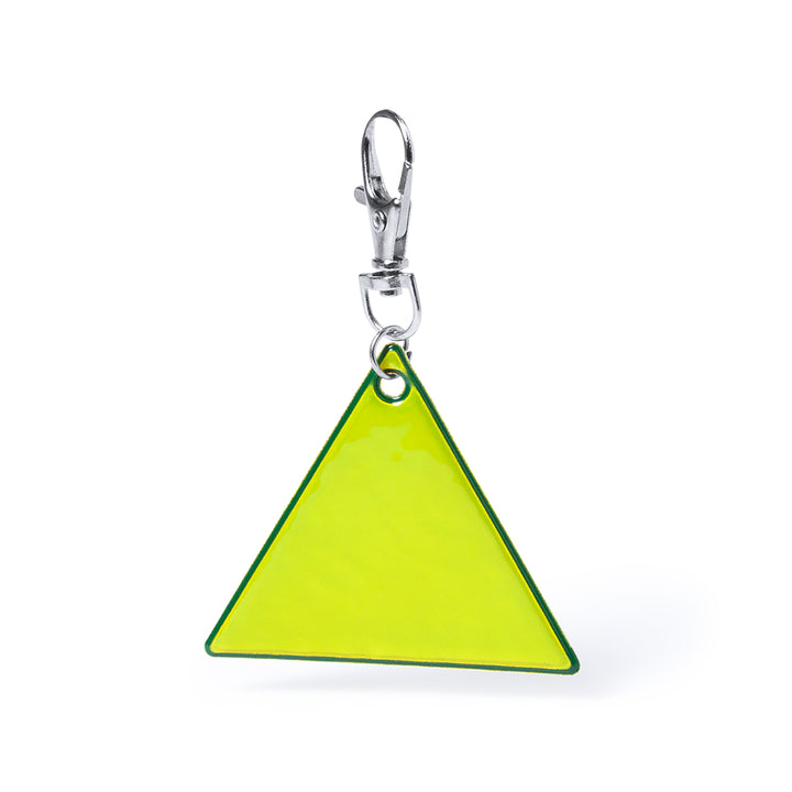 Schlüsselanhänger mit dreieckigem Design aus reflektierendem PVC mit hoher Sichtbarkeit und Karabiner zur Befestigung.