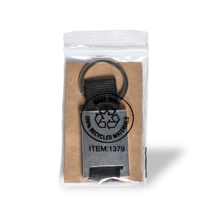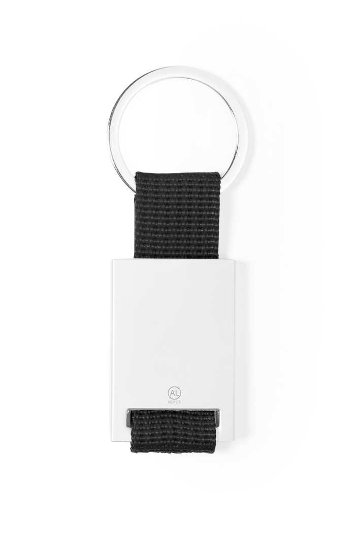Schlüsselanhänger mit Gehäuse aus recyceltem Aluminium mit silberner Oberfläche und farbigem Band. Große Beschriftungsfläche und Plakette aus recyceltem Aluminium. Mit passendem Metall-Schlüsselring und in einem individuellen Beutel mit Kraftkarton präsentiert.Recyceltes Aluminium ist ein Material mit nahezu unendlichen Recyclingmöglichkeiten, das seine ursprünglichen Eigenschaften nicht verliert und dabei weniger Energie verbraucht.