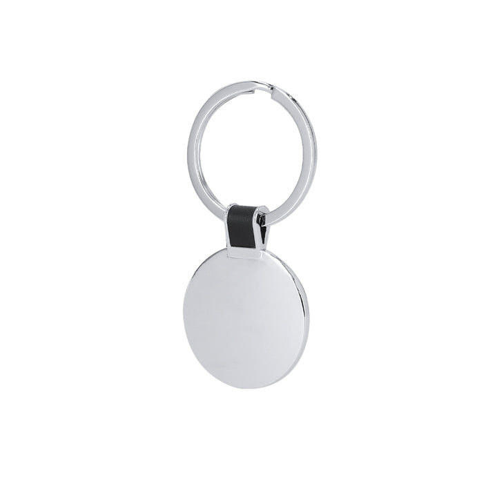 Metallischer Schlüsselanhänger mit Detail in Schwarz.