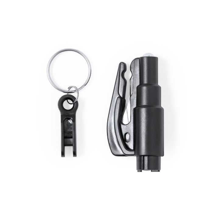 Praktischer Schlüsselanhänger mit Nothammer, Fensterbrecherfunktion und Gurtschneiderklinge. Präsentiert in einer individuellen Kraftbox.