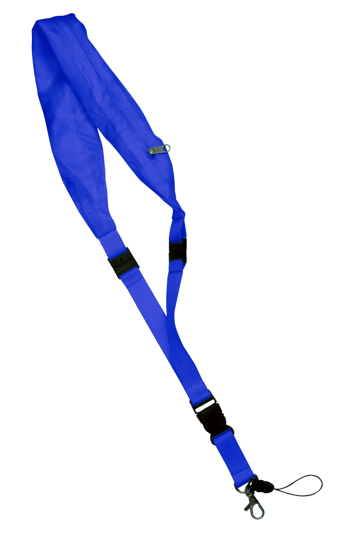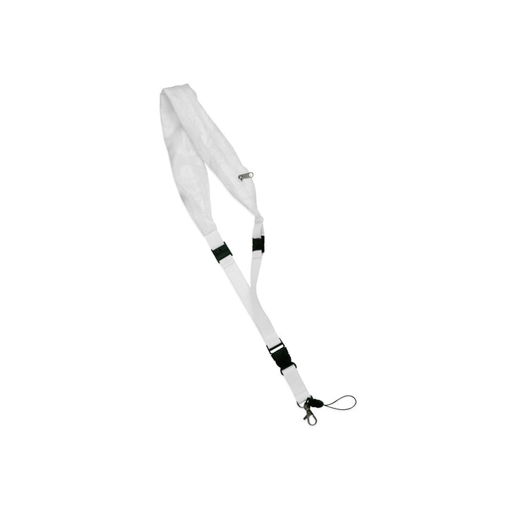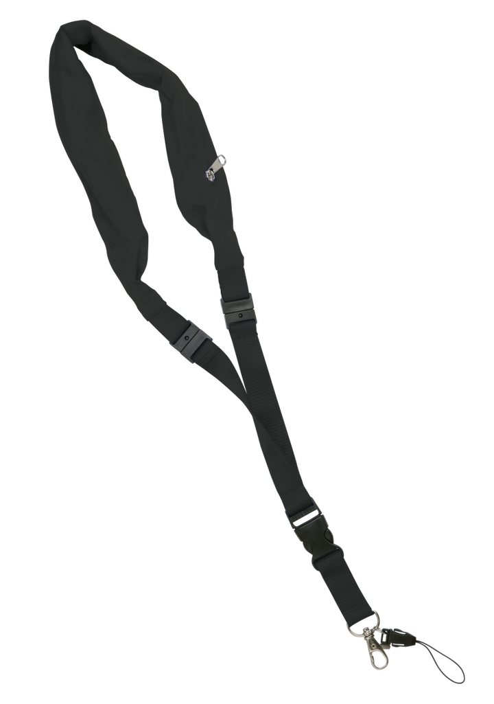 Lanyard aus weichem, robustem Polyester mit im Nacken integrierter, wasserdichter Kapuze aus Nylon - versteckt unter einem Reißverschluss. Abnehmbar durch Klickverschluss. Zudem mit Metallkarabiner und Bändchen.