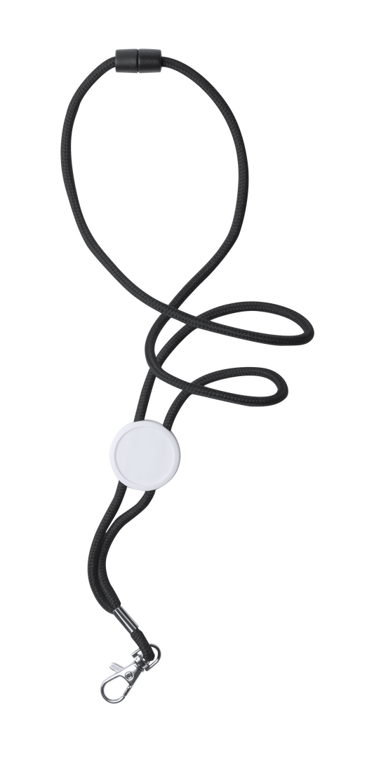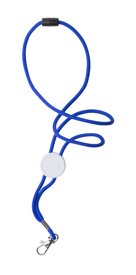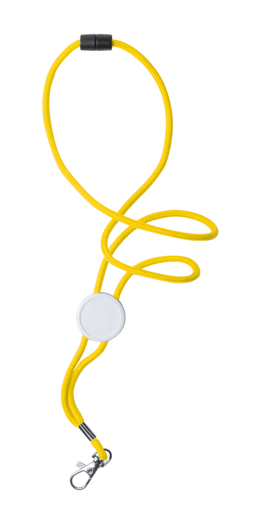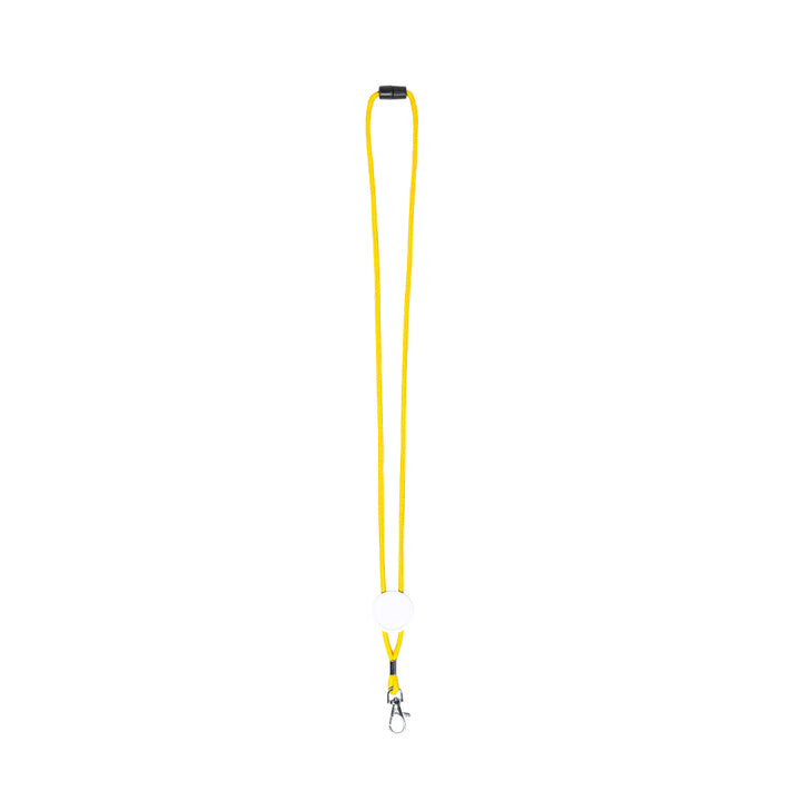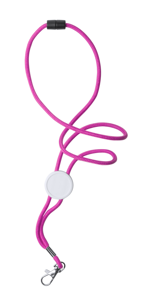 Lanyard mit robuster Kordel aus weichem Polyester in verschiedenen lebendigen Farben. Mit Klickverschluss am Nacken, Befestigungskarabiner aus Metall und zentraler Fläche zum Bedrucken.
