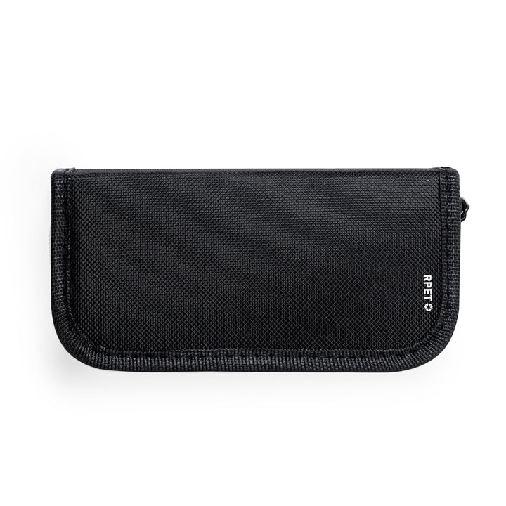 Praktisches Schuhputzset im RPET-Koffer. Komplettpaket zum Reinigen von Schuhen mit zwei weichen Borstenbürsten, Schuhlöffel, Wachsdose und Tuch, damit alle Schuhe glänzen. Präsentiert in einem praktischen Etui mit Reißverschluss und Gummizug, um alle Utensilien zu organisieren. Mit RPET-Logo auf dem Koffer.RPET wird aus recyceltem Kunststoff hergestellt, um die Wiederverwendung von Kunststoffabfällen zu fördern und die Nachhaltigkeit des Planeten zu unterstützen.