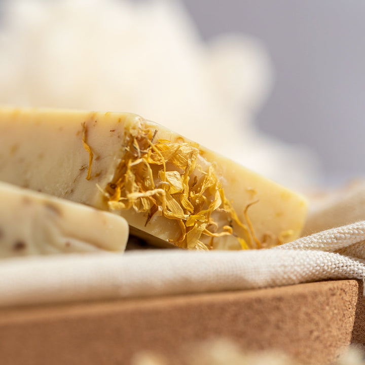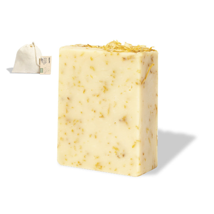 Veganes Seifenstück von 100 gr. Calendula und Kamillenduft mit beruhigenden, feuchtigkeitsspendenden und reparierenden Eigenschaften. Dermatologisch getestet und in Europa hergestellt. Präsentiert in einer individuellen Baumwolltasche mit Kordelzugverschluss und einem unverwechselbaren Etikett.Nachhaltiges und 100% veganes Produkt ohne tierische Inhaltsstoffe. Für diese Produkte wurden keine Tierversuche durchgeführt, um den Schutz und den Respekt für alle Tiere zu fördern.