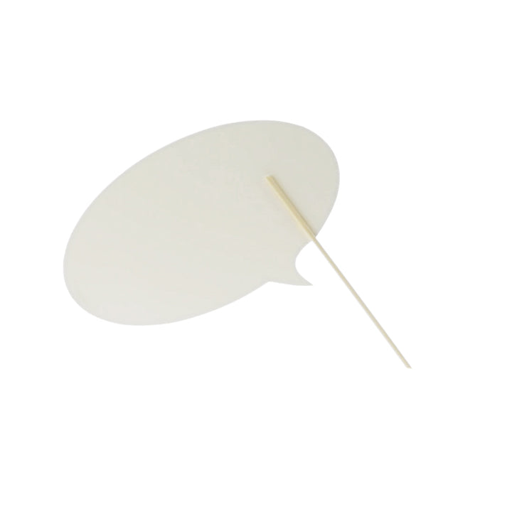Selfie-Sprechblase in auffälligem Gelb mit großer Druckfläche. Hergestellt aus Pappe mit Holzgriff.