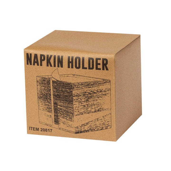 Nützlicher Serviettenhalter aus Holz. Industriedesign, aus weichem Naturholz mit einem Schlitz auf einer Seite für einfachen Zugriff auf die Servietten. Präsentiert in einer Kraft-Design-Box.