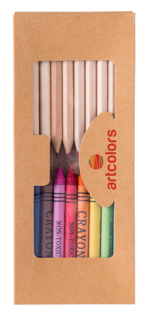 19-teiliges Set in einer Schachtel aus Naturkarton mit Fenster und herausnehmbarem Fach. Enthält Wachsmalstifte mit zylinderförmigem Schaft und Bunstifte aus Naturholz mit sechseckigem Schaft in verschiedenen Farben.
