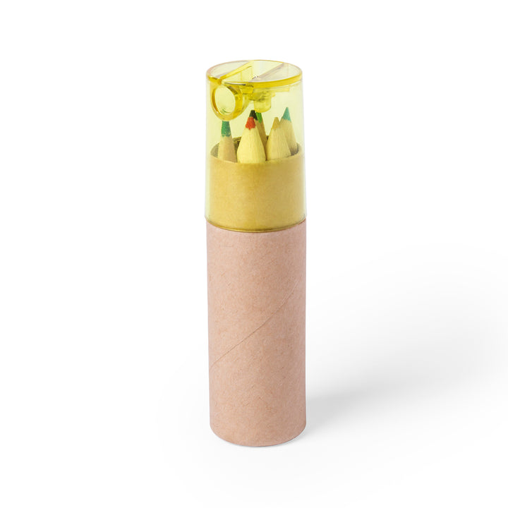7-teiliges Set in einer zylinderförmigen Box aus Naturkarton mit transparentem Deckel in verschiedenen Farben. Enthält 6 Buntstifte mit sechseckigem Schaft in Naturfarbe und einen im Deckel integrierten Anspitzer.