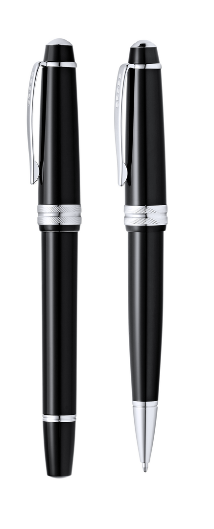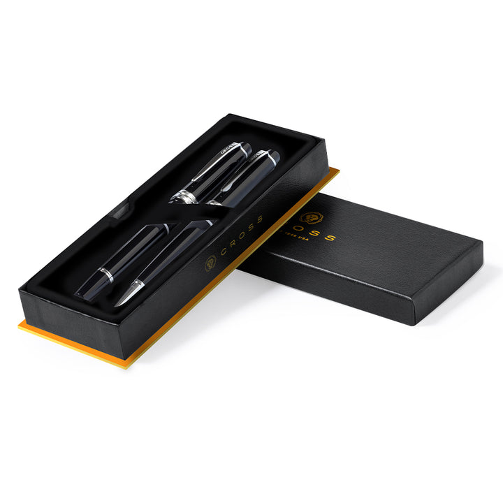 Set aus Kugelschreiber und Roller Cross Bailey Light. Eine Kombination aus hochglänzenden Harz und polierten Chrom, metallische Oberfläche. Jumbo-Patrone und schwarze Tinte. Präsentiert in einem eleganten, individuellen schwarzen Etui mit Markenlogo und weichem Wildlederfutter.