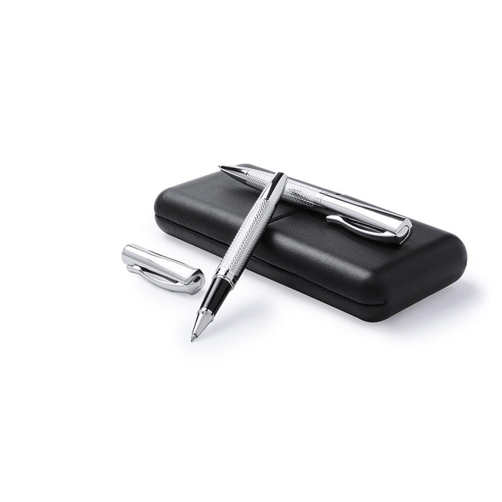 Das Set Darius vereint Funktionalität und Eleganz in einem stilvollen Design. Es besteht aus einem Kugelschreiber mit Drehmechanismus und einem Tintenroller, die beide durch ihre schlichte Schönheit und den rutschfesten Metallschaft in glänzendem Silber bestechen. Die farblich abgestimmten Clips ergänzen das elegante Gesamtbild.