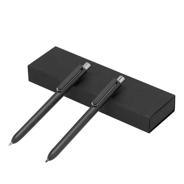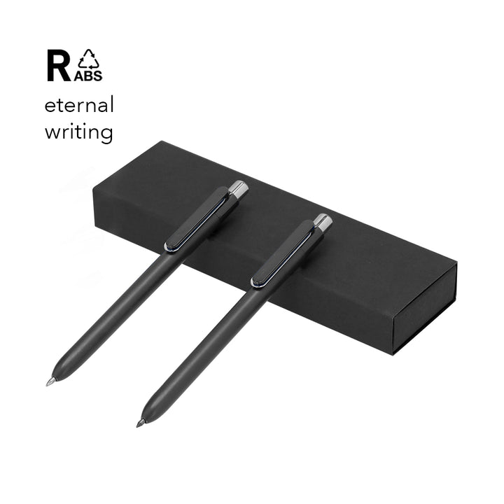 Set bestehend aus einem blauen Tintenroller und einem ewigen Bleistift, beide aus RABS gefertigt. Der ewige Bleistift bietet kontinuierliches Schreiben, vermeidet Abfall zu erzeugen, und beide verfügen über einen Druckmechanismus. Entworfen mit passendem Clip und chromatischen Details. Präsentiert in einer schwarzen Schachtel aus recyceltem Karton. Mit gedrucktem RABS-Symbol.