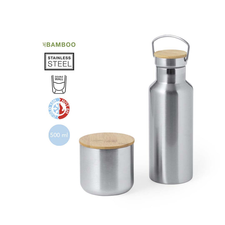 Das Set Debris vereint durchdachtes Design und herausragende Funktionalität in einem stilvollen Trink- und Thermobecher-Set. Hergestellt aus rostfreiem Edelstahl und Bambus, bietet es sowohl optische Raffinesse als auch praktische Vorteile. Mit einer 500 ml Thermoflasche und einem 300 ml Trinkbecher ist dieses Set die perfekte Wahl für alle, die ihre Getränke unterwegs oder im Alltag genießen möchten.