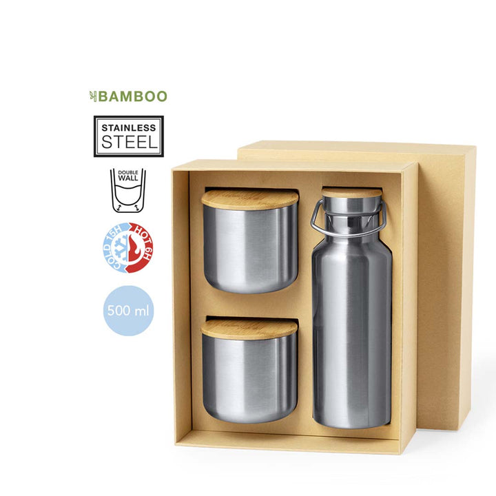 Die 500 ml Thermoskanne überzeugt durch ihre Widerstandsfähigkeit und Langlebigkeit. Die Bambus-Details an der Oberseite und dem Griff verleihen ihr eine moderne und natürliche Note. Die zwei Becher mit einem Fassungsvermögen von je 300 ml bestehen ebenfalls aus Edelstahl und haben Bambusdeckel mit einem praktischen Push-on-Verschluss, der für sicheren Halt sorgt und den einfachen Zugang zu Ihren Getränken ermöglicht.