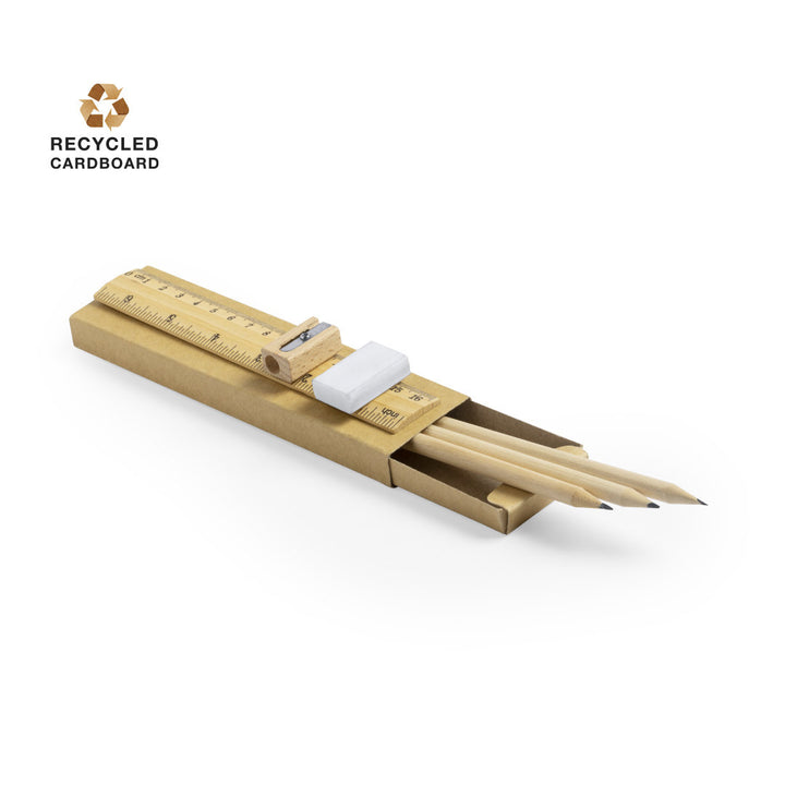 6-teiliges Set aus drei Holz-Bleistiften mit rundem Körper in Naturfarbe und schwarzer Mine. Zudem mit 20 cm langem Lineal mit Skala in Zentimetern und Zoll, sowie Radiergummi und Anspitzer. Präsentiert in einer Schachtel aus recyceltem Karton.