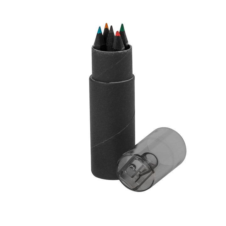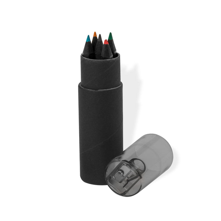 Set mit 6 Holzstiften in schwarzer Farbe, mit sechseckigem Schaft und Minen in verschiedenen Farben. Präsentiert in einer zylindrischen Box aus schwarzem Recycling-Karton, mit passender transparenter Haube und integriertem Bleistiftspitzer.