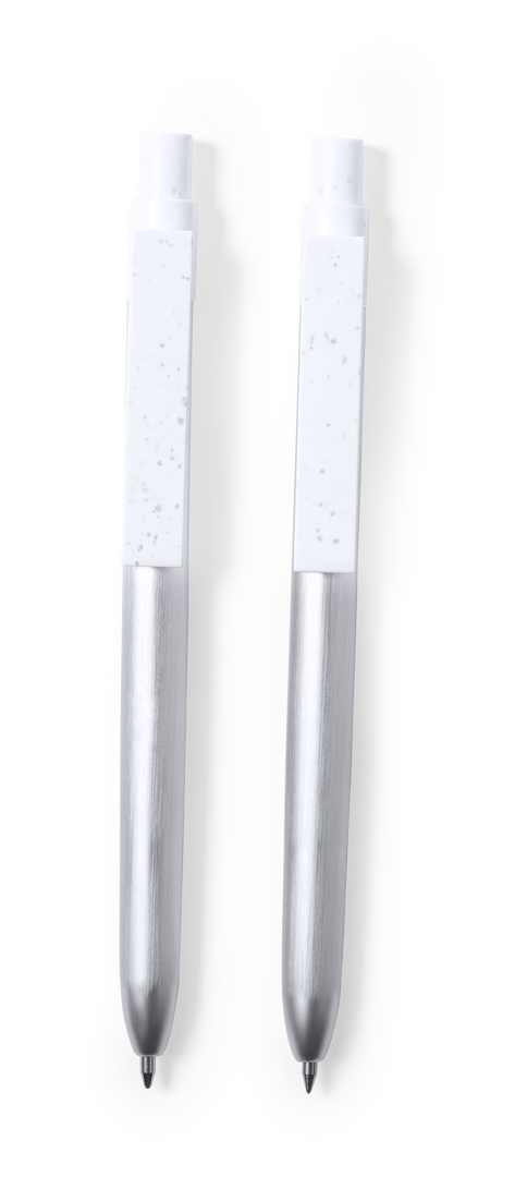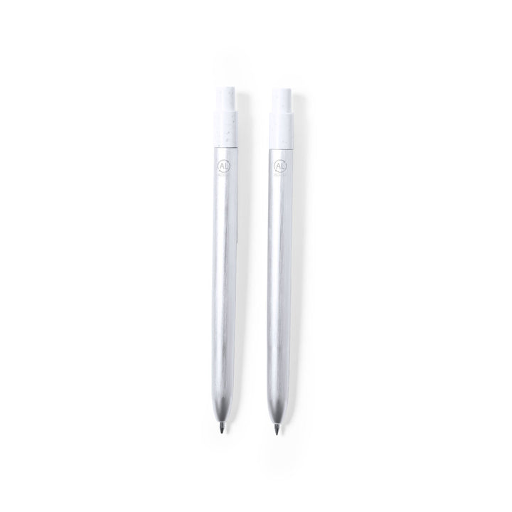 Umweltfreundliches Set aus Kugelschreiber und Tintenroller aus recyceltem Aluminium und mit Details aus recyceltem ABS (RABS). Enthält:Kugelschreiber aus recyceltem Aluminium mit Druckknopfmechanik, silberfarbenem Gehäuse und weißen Beschlägen. Mit Logo für recyceltes Aluminium auf der Oberseite des Kugelschreibers, Jumbo-Patrone und blaueschreibender Tinte.Tintenroller aus recyceltem Aluminium mit Druckknopfmechanik, silberfarbenem Gehäuse und weißen Beschlägen. Mit Logo für recyceltes Aluminium auf der Oberseite des Kugelschreibers, Jumbo-Patrone und blaueschreibender Tinte.Das Set wird in einem individuellen Kraftdesign-Etui mit passender Hülle präsentiert.Recyceltes Aluminium hat seinen Ursprung in der nahezu unbegrenzten Wiederverwendung eines der am besten recycelbaren Materialien, wobei die Qualität des Produkts erhalten bleibt. Diese Eigenschaft macht es zu einem umweltfreundlichen Material recycelten Ursprungs, das leicht wiederverwertet werden kann. Außerdem können neue Materialien und Ressourcen aus den Aufbereitungs- und Abfallprozessen gewonnen werden, wodurch weniger Energie und andere nachhaltige Faktoren verbraucht werden.GRS-Zertifizierung (Global Recycled Standard), die die recycelte Herkunft des für die Herstellung des Produkts verwendeten Materialien garantiert.