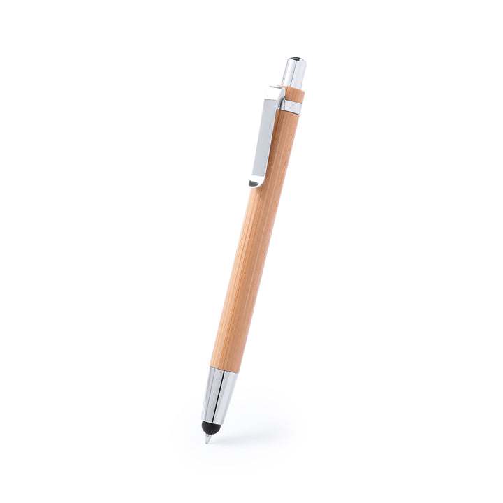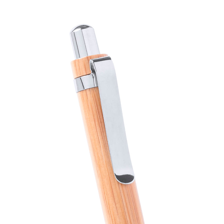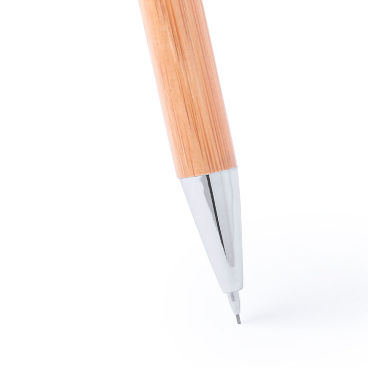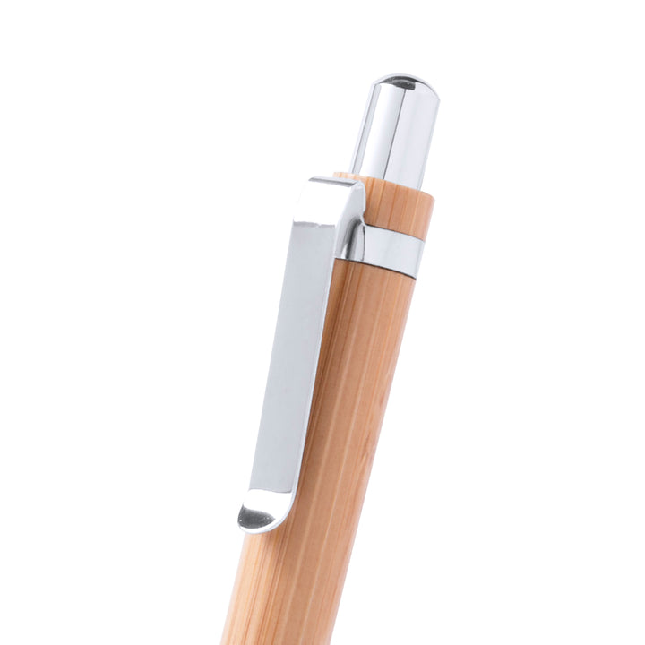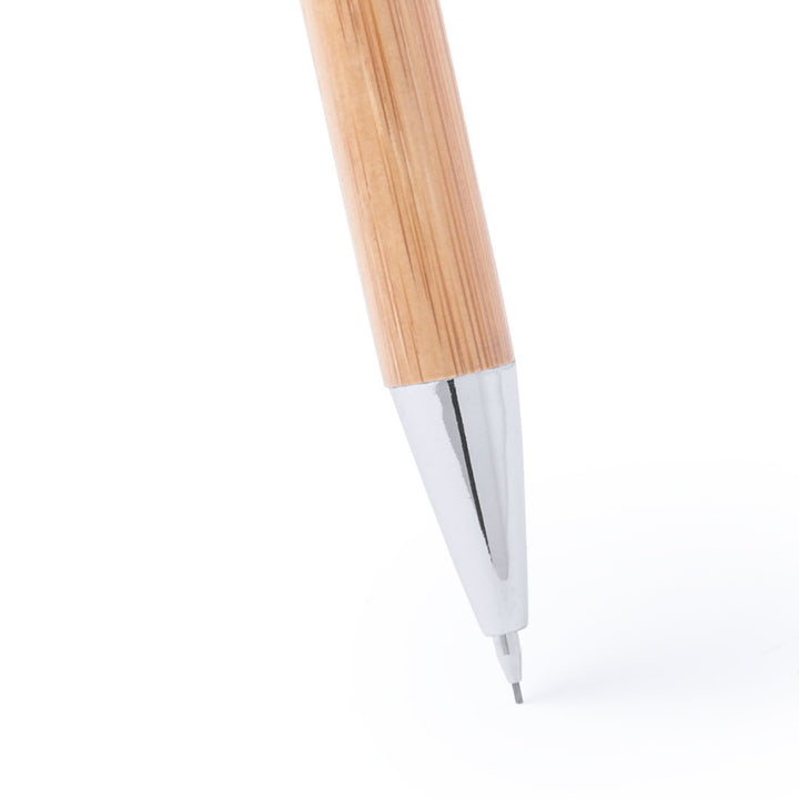 Set aus Druck-Kugelschreiber und Druck-Bleistift mit Schaft aus natürlichem Bambusholz und Kontrastdetails in glänzendem Silber-Metallic. Präsentiert in einer glänzenden Karton-Schachtel im Holz-Look. Kugelschreiber mit Jumbo-Patrone mit blauer Tinte und Bleistift mit 0,7 mm Minen.