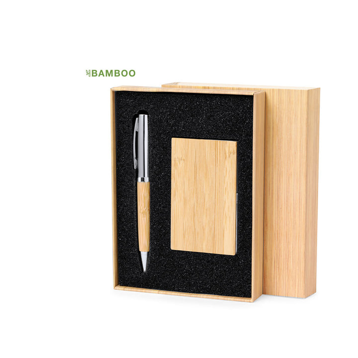 Das Set Jarviner verbindet stilvolles Design mit einem klaren Bekenntnis zur Nachhaltigkeit. Es umfasst einen eleganten Kugelschreiber und ein hochwertiges Visitenkartenetui, die aus einer harmonischen Kombination von Metall und Bambus gefertigt sind. Der Kugelschreiber besticht durch seinen glänzenden Metallschaft und den ergonomischen Bambusgriff, der für ein angenehmes und komfortables Schreiben sorgt. Mit seinem praktischen Drehmechanismus und der blauen Tinte ist er ideal für den täglichen Einsatz.