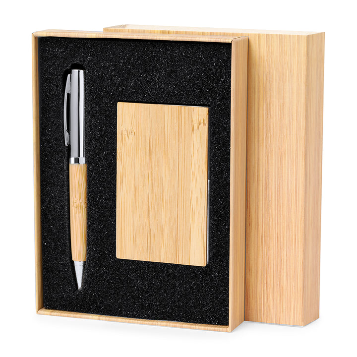 Das Visitenkartenetui bietet ausreichend Platz für Ihre wichtigsten Karten und zeichnet sich durch eine edle Metalloberfläche aus, die mit einem weichen Bambusbezug verfeinert ist. Es stellt ein elegantes und funktionales Accessoire für den beruflichen Alltag dar. Beide Komponenten des Sets werden in einer stilvollen Bambus-Designbox präsentiert, die nicht nur visuell beeindruckt, sondern auch die umweltbewusste Philosophie des Produkts widerspiegelt.