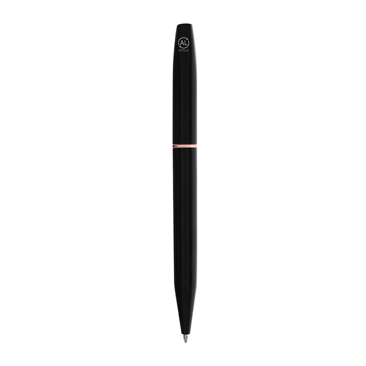 Notizblock- und Stiftset aus recyceltem PU und recyceltem Aluminium. In elegantem mattschwarz mit edlen Accessoires in Roségold.Notizbuch mit Hardcover aus recyceltem PU, magnetischem Verschluss und Verzierungen in Roségold. Mit 80 creme-farbenen Seiten im Einlinien-Layout, passendem Lesezeichen und Stifthalter innen, sowie dem Logo aus recyceltem PU auf der Rückseite.Das Set umfasst außerdem einen Kugelschreiber aus recyceltem Aluminium in mattschwarz mit Akzenten in Roségold und Metallclip. Drehmechanismus und blaue Tinte, mit Logo aus recyceltem Aluminium.Präsentation in einem eleganten schwarzen Etui.Recyceltes PU-Leder zeichnet sich durch seine Widerstandsfähigkeit und Elastizität aus. Dieses recycelbare Material ist eine nachhaltige Option, die Fasern wiederverwendet, die bei der Herstellung sonst verschwendet würden, und so zur Reduzierung der Umweltbelastung beiträgt, ohne seine ursprünglichen Eigenschaften zu verlieren.Recyceltes Aluminium ist ein Material mit nahezu unendlichen Recyclingmöglichkeiten, das seine ursprünglichen Eigenschaften behält und weniger Energie im Prozess verbraucht.GRS (Global Recycled Standard) Zertifizierung, die die recycelte Herkunft des für das Produkt verwendeten Materials garantiert.