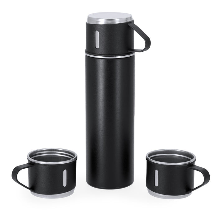 Set aus Thermosflasche und 3 Tassen aus Edelstahl. Doppelwandige Thermosflasche mit 420 ml Fassungsvermögen, die eine bessere und länger anhaltende Temperaturerhaltung gewährleistet, mit Sicherheitsausgießer. 140 ml Schraubbecher mit elegantem schwarzen Design, ideal für heiße oder kalte Getränke, jederzeit und überall. Präsentiert in einem eleganten schwarzen Etui.