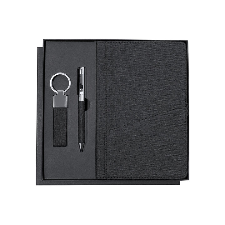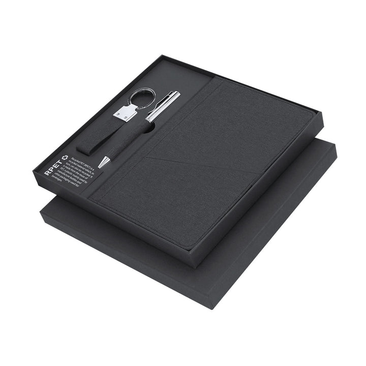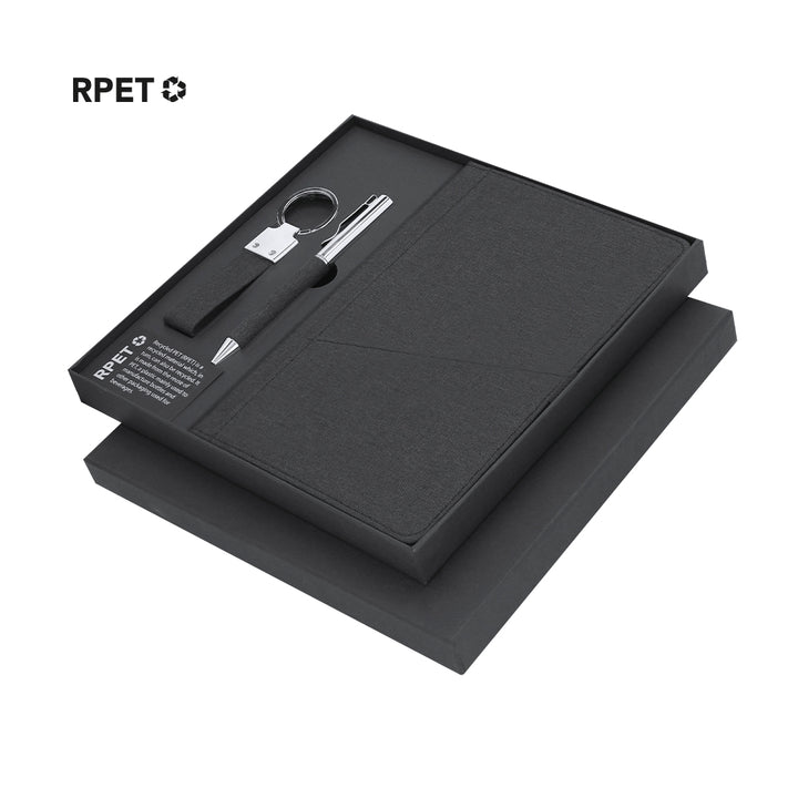 Elegantes Premium-Set, das enthält:Notizblock aus RPET in elegantem Schwarz. Einschließlich elastischem Verschluss, Fronttasche und Stoff-Lesezeichen. Innen mit 80 Blättern im linierten Format.Kugelschreiber aus RPET mit mattem Schwarz-Finish, mit Drehmechanismus und blauer Tinte. Mit Clip und polierter Metallspitze.Eleganter Schlüsselanhänger mit Band aus 300D RPET-Polyester und verchromten Zubehör.Set präsentiert in einer individuellen Schachtel mit Matt-Oberfläche, mit Innenschnitt für jedes Element des Sets und RPET-Karte im Inneren.Das RPET-Material wird aus recyceltem Plastik hergestellt, um die Wiederverwendung von Plastikabfällen zu fördern und zur Nachhaltigkeit des Planeten beizutragen.