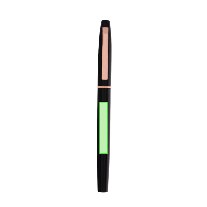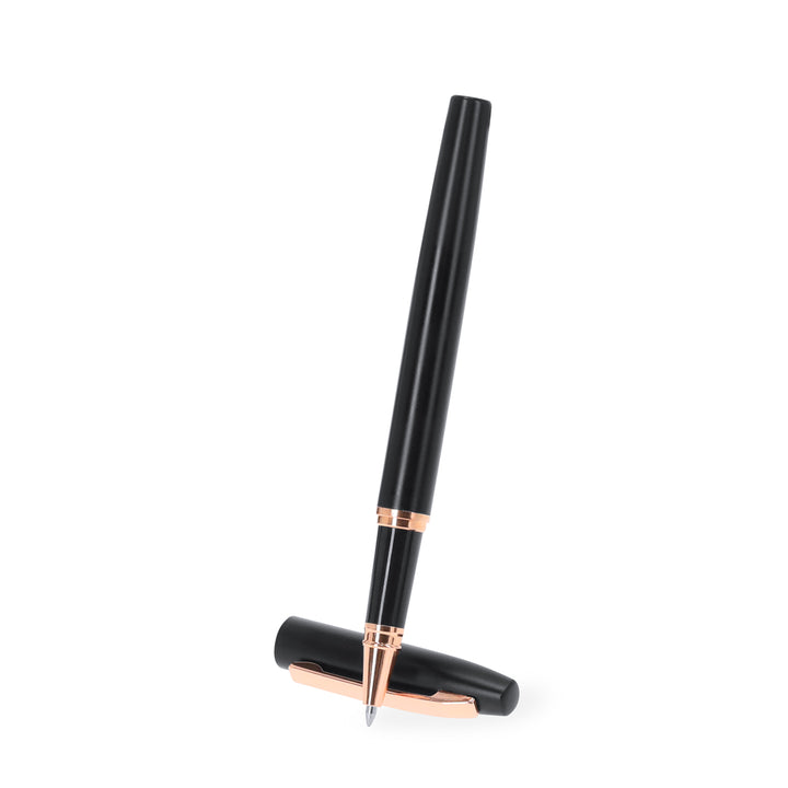 Kugelschreiber und Rollerball aus recyceltem Aluminium, im eleganten matten Schwarzdesign mit edlen Fittings in Rosa-Gold. Drehmechanismus beim Kugelschreiber und Kappe beim Rollerball, beide mit Metallclip. Mit blauer Tinte und recyceltem Aluminium Logo. Präsentiert in einem eleganten schwarzen Etui.Recyceltes Aluminium ist ein Material mit nahezu unendlichen Recyclingmöglichkeiten, das seine ursprünglichen Eigenschaften behält und weniger Energie im Verarbeitungsprozess verbraucht.GRS (Global Recycled Standard) Zertifizierung, die die recycelte Herkunft des für das Produkt verwendeten Materials garantiert.
