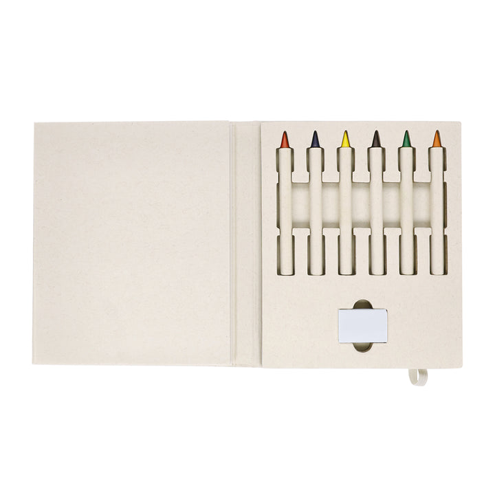 Set mit ewigen Farbstiften aus recycelten Milchkartons. Dieses Set enthält 6 ewige Farbstifte, einen Radiergummi und ein Notizbuch mit 50 leeren Blättern. Mit praktischem Gummibandverschluss und dem Logo aus recycelten Milchkartons.Milchkartons bestehen größtenteils aus Karton und Aluminium. Während des Recyclingprozesses werden die verschiedenen Verpackungsmaterialien zur Wiederverwendung und Neunutzung getrennt, was zum unendlichen Kreislauf der Kreislaufwirtschaft beiträgt. Dieses Material ist bekannt für seine hohe Recyclingfähigkeit sowie seine Leichtigkeit und Widerstandsfähigkeit.