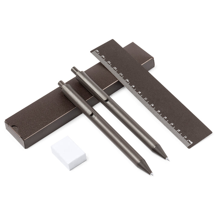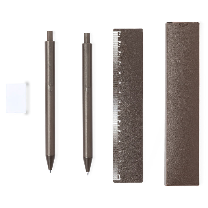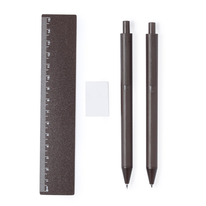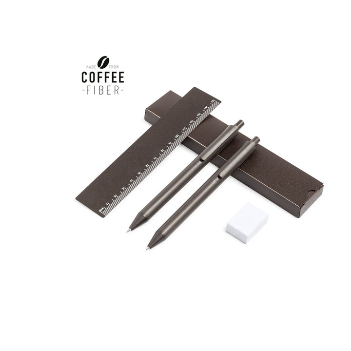 Das Set Proston bietet eine gelungene Kombination aus praktischer Anwendung und umweltfreundlicher Innovation. Es umfasst einen Kugelschreiber, einen Druckbleistift und ein Lineal, die aus nachhaltiger Kaffeefaser hergestellt sind. Mit seinen kompakten Maßen von 3,4 cm Länge, 16,5 cm Höhe und 1,5 cm Breite ist dieses Set besonders handlich und eignet sich hervorragend für den täglichen Gebrauch.