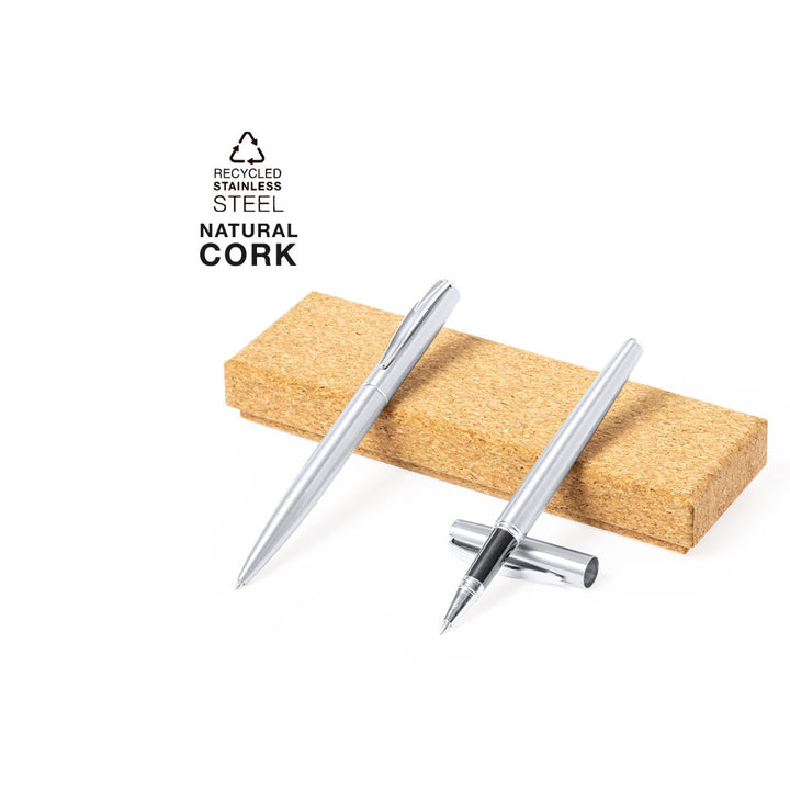 Der glänzende Schaft jedes Stiftes trägt das Logo für recycelten Edelstahl, was nicht nur das elegante Design unterstreicht, sondern auch Ihre Entscheidung für nachhaltige Materialien betont. Das Set wird in einem stilvollen Korketui geliefert, das zusätzlich Schutz bietet und die umweltfreundliche Ausrichtung des Produkts hervorhebt.